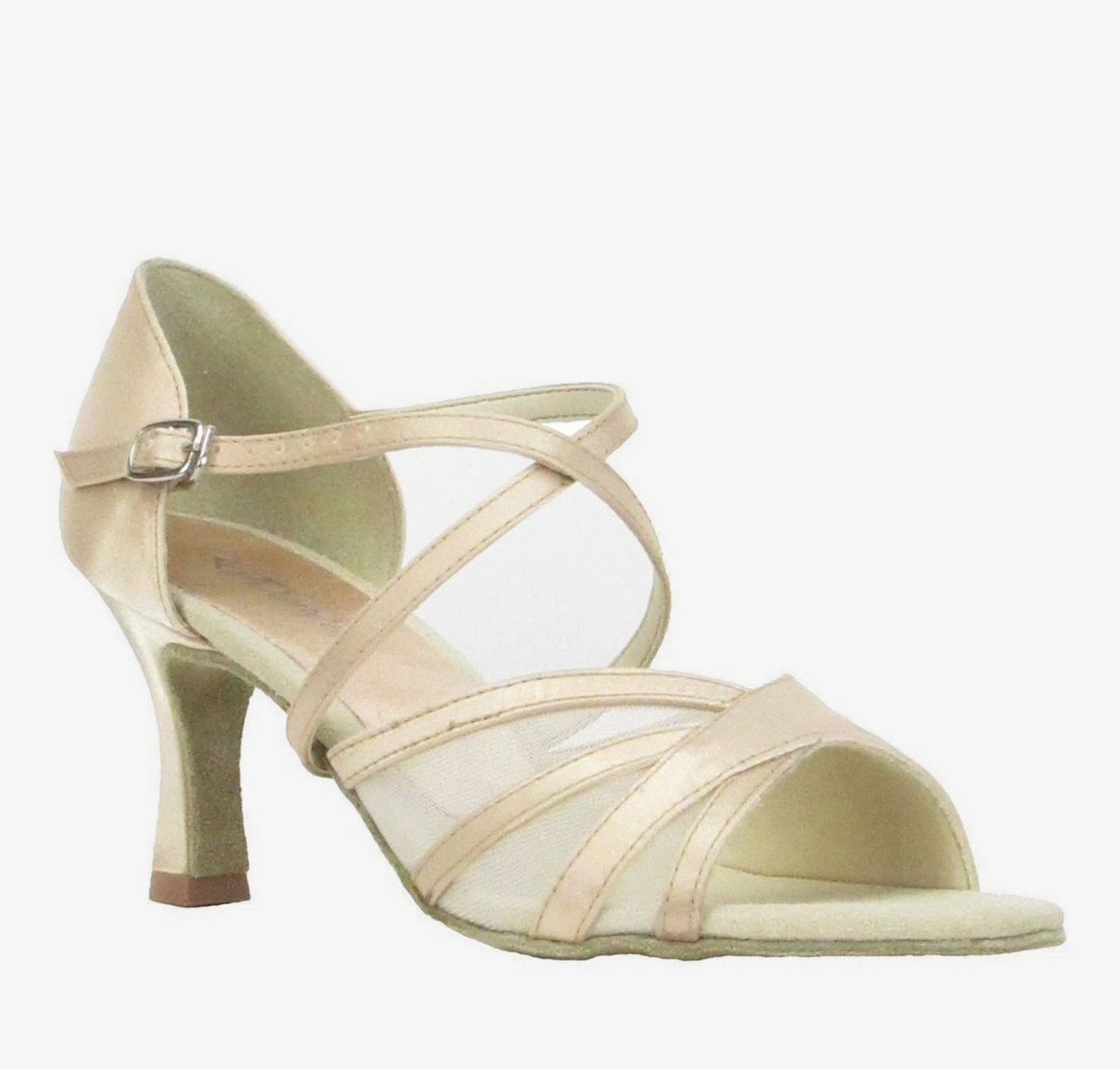2.5 Heel Ballroom Shoe with Mesh Straps BL162 from So Danca is an exceptional ballroom shoe. The flattering crossed satin straps provide you with stability through the arch while having the freedom of movement. These ballroom shoes feature mesh between the straps that give you an extra edge while providing comfort. With the angled shank with suede sole and cushioned insole, you will be dancing for hours with the ease of movement. Also, there is a rhinestone buckle that slips onto the clip so there is no fussing with the strap. The ballroom shoes have a main strap that slides through the sole under the arch that customizes the fit.
