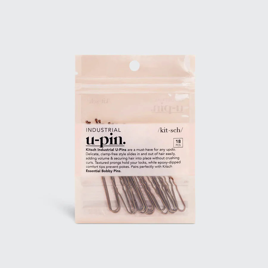 The Kitsch PRO U Pins - Brown 5281 will create amazing messy buns, french twists, or formal chignons. With a delicate clamp-free range of motion, they slide in and out of hair easily, and the textured prongs lock your locks in place. Pairs perfectly with Kitsch Essential Bobby Pins for ultimate styling success.