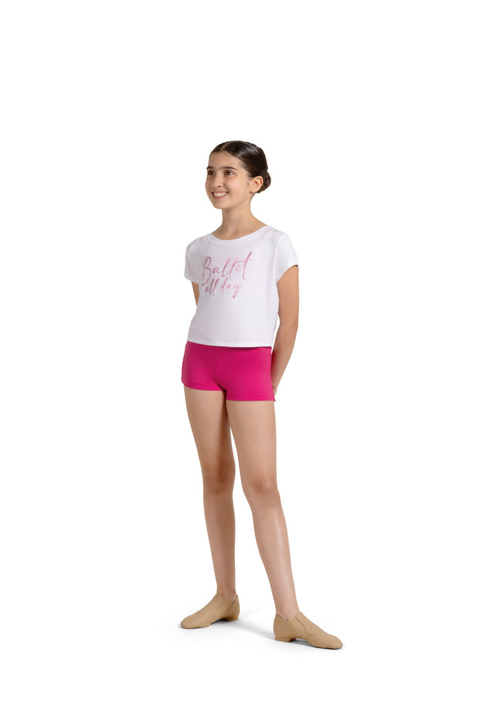 The Ballet Print T-Shirt M745C from Mirella is perfect addition to your dancewear collection. This t-shirt is available in three colours and includes the words "Ballet all day" on the front.